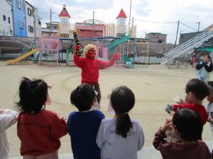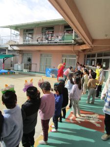 ホールに集まり由来などの節分クイズをしました。正解すると大喜びの子ども達でしたよ。